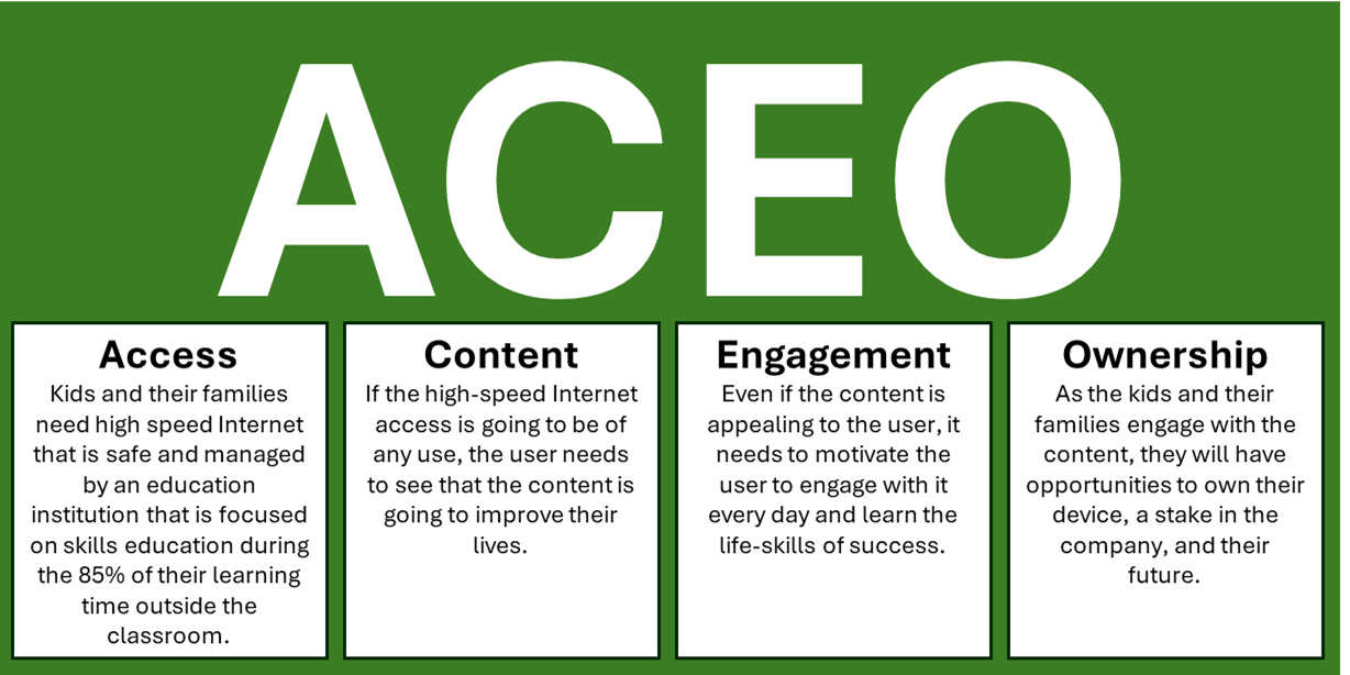 The key components of the “black box” are what we call A.C.E.O. - these are the critical components that protect our business from anyone else entering the market. This is why we can say we have an education monopoly.