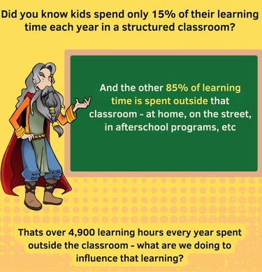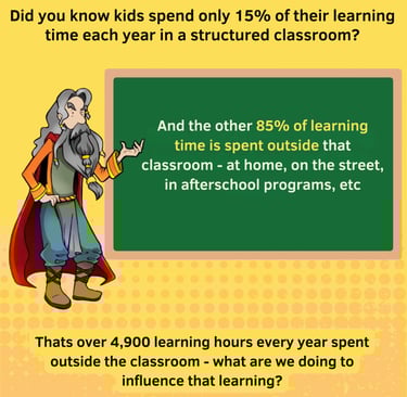 To create a “shadow education” system that utilizes the 85% of a child’s learning time that is spent outside the classroom and changes the behavior of the child and the adults around them to become the smartest, healthiest, hardest-working and most character driven workers on the planet.